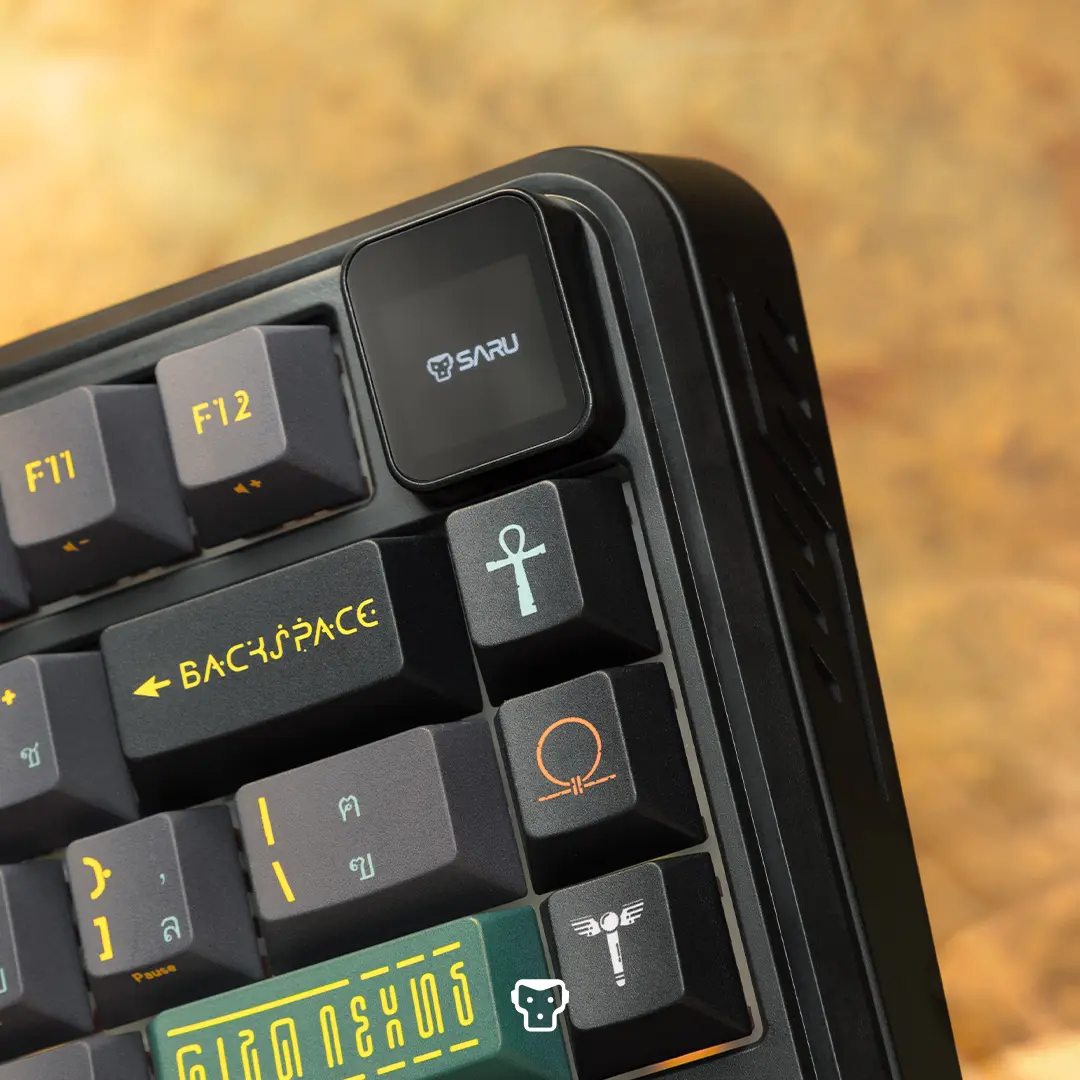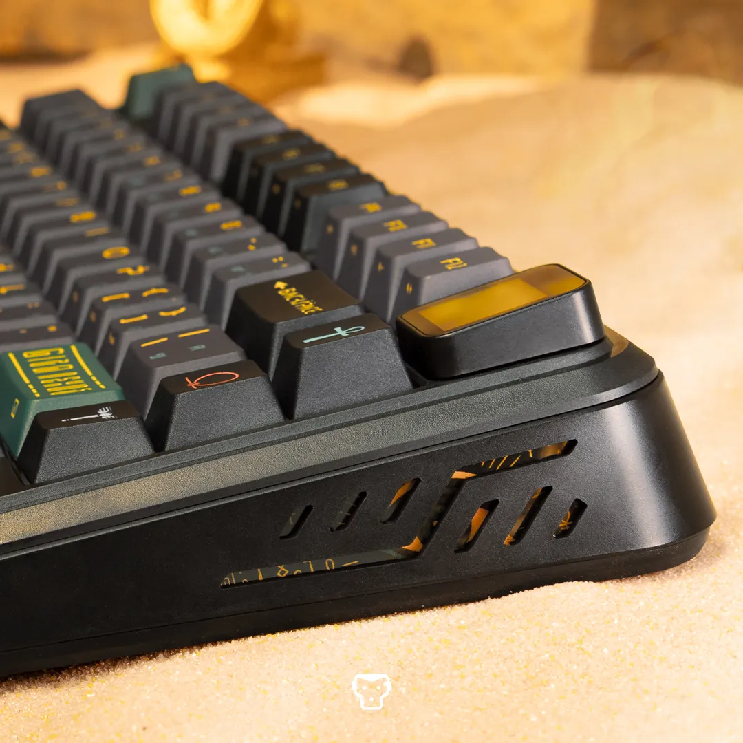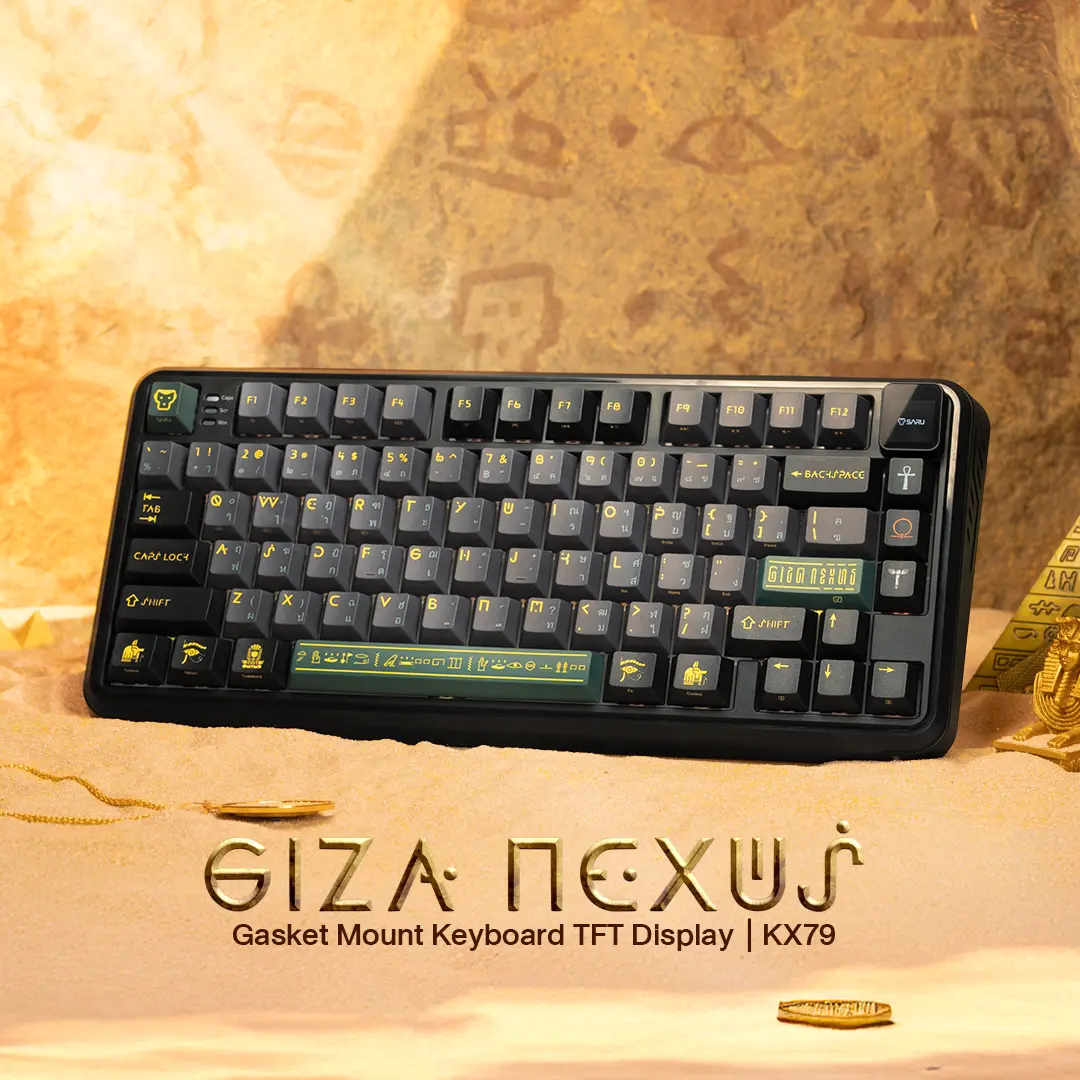 พีระมิดแห่งกีซา ดวงตาแห่งฮอรัส เส้นสายอักขระโบราณที่รายล้อม ถ่ายทอดลงคีย์บอร์ด…สู่ปลายนิ้วของคุณ กับคีย์บอร์ดรุ่น KX79 GIZA NEXUS ขนาด 75% 80 ปุ่ม มาพร้อม จอสี TFT Color Screen มัลติฟังก์ชันในตัว แสดงโหมดการเชื่อมต่อ แบตเตอรี่ เอฟเฟกต์ไฟ RGB แบบเรียลไทม์ คีย์แคป PBT สวิตช์ KTT Hot-Swappable สูงสุด 5 PIN ถอดเปลี่ยนได้ง่ายตอบโจทย์สายคัสตอม โครงสร้าง Gasket ช่วยซับแรงกด พร้อมโฟมลดเสียง ให้สัมผัสนุ่ม เงียบ และเสียงแน่น